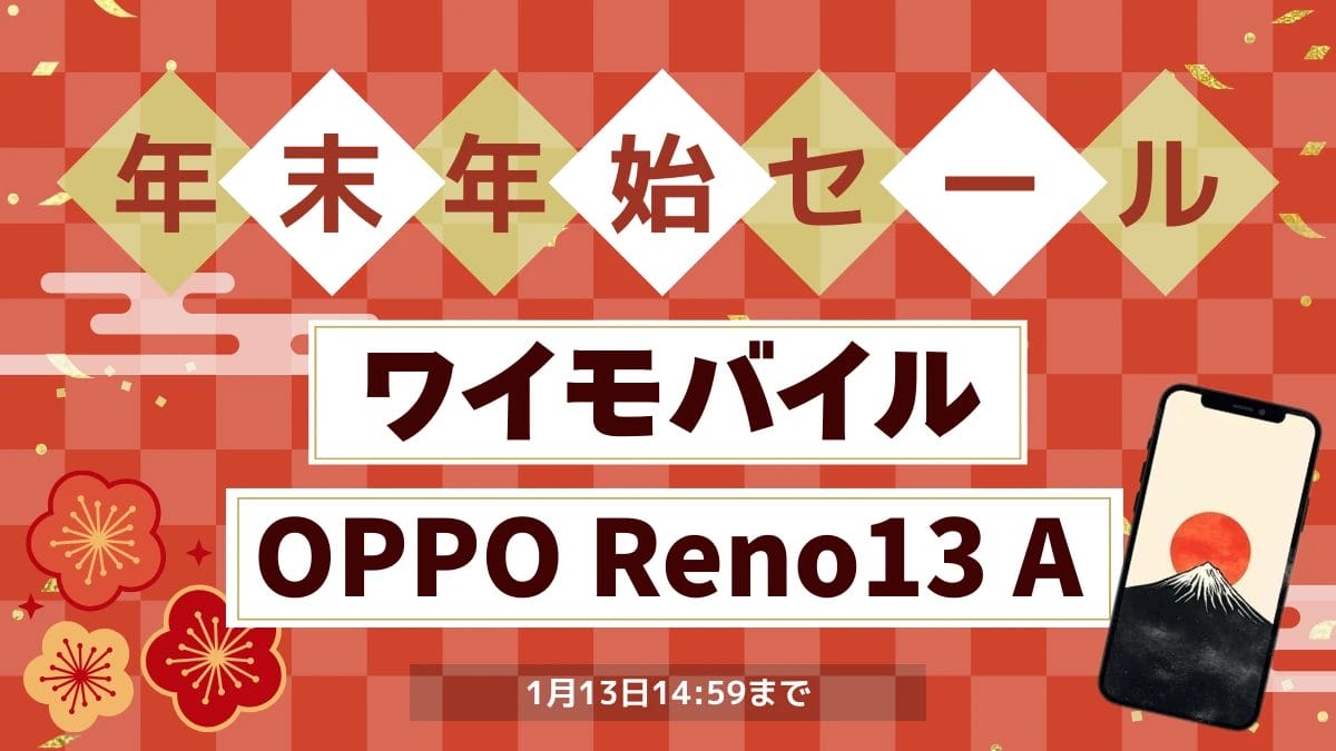 ワイモバイルが1月13日14:59まで、オンラインストア限定の年末年始セールを開催しています。対象はOPPO最新モデルのReno13 Aで、一括なら21,600円の半額、2年返却プラン利用なら実質24円で買える大幅割引中です。