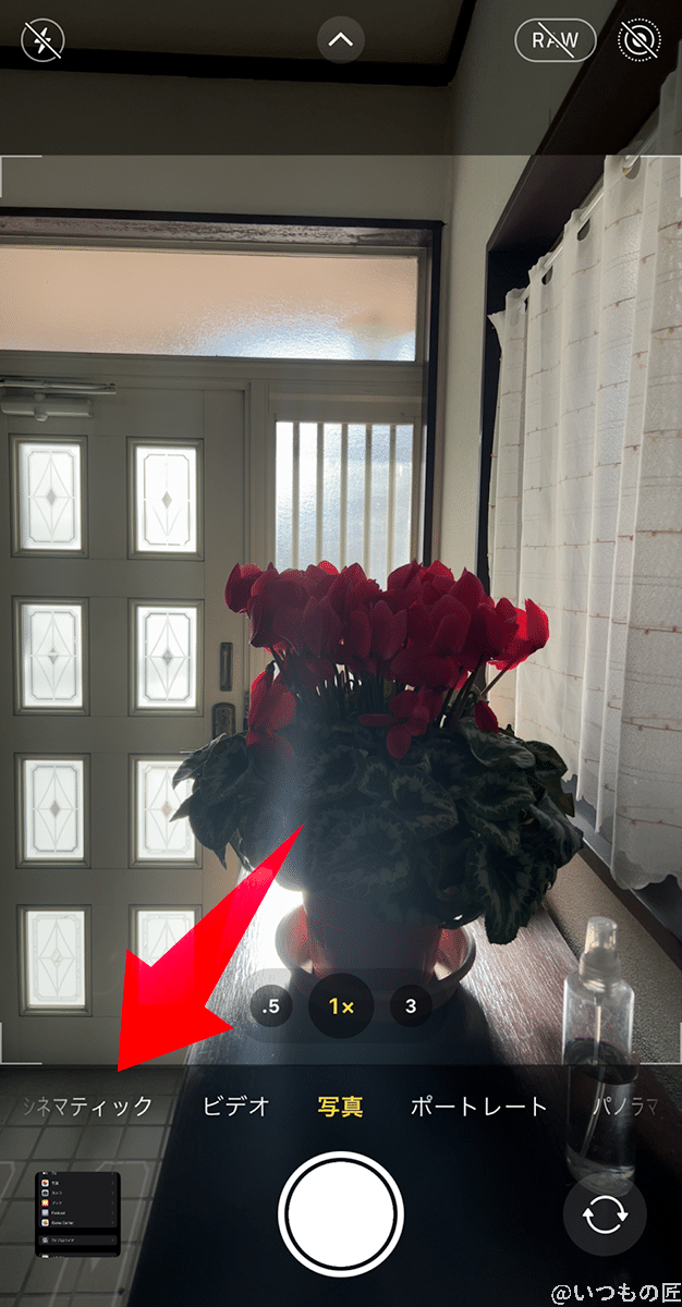 まずはカメラアプリを起動して、シネマティックモードを選択します。