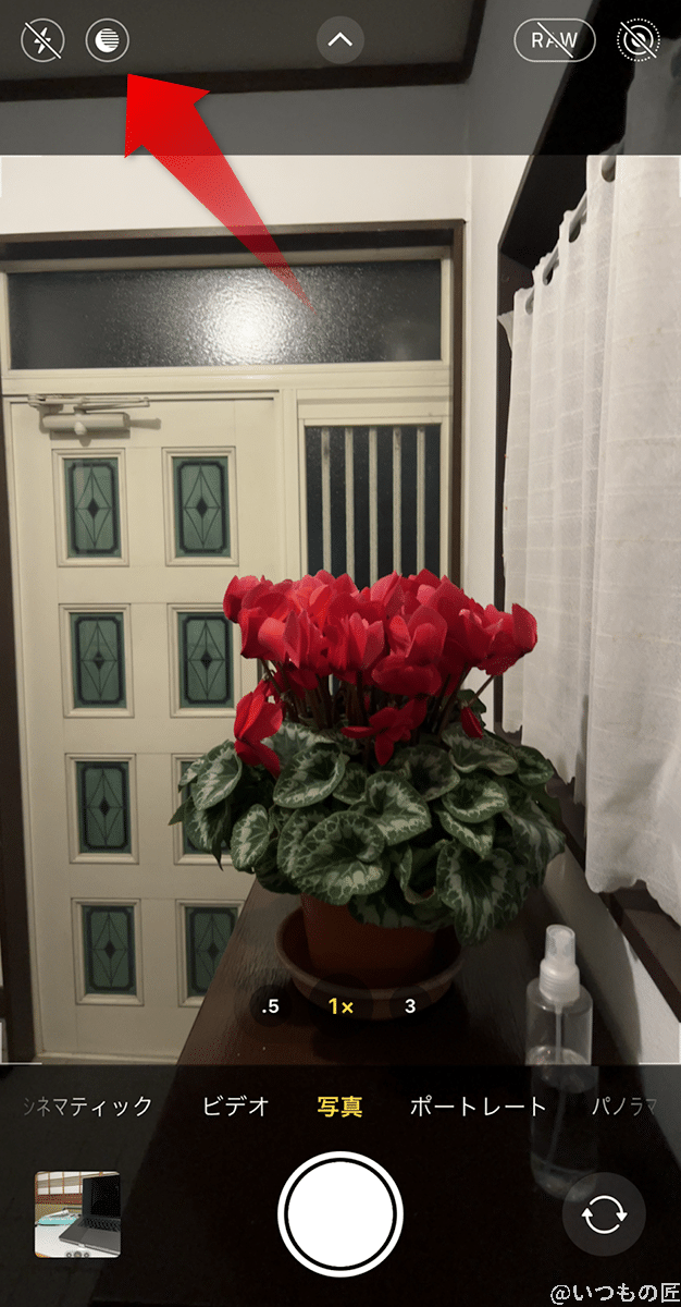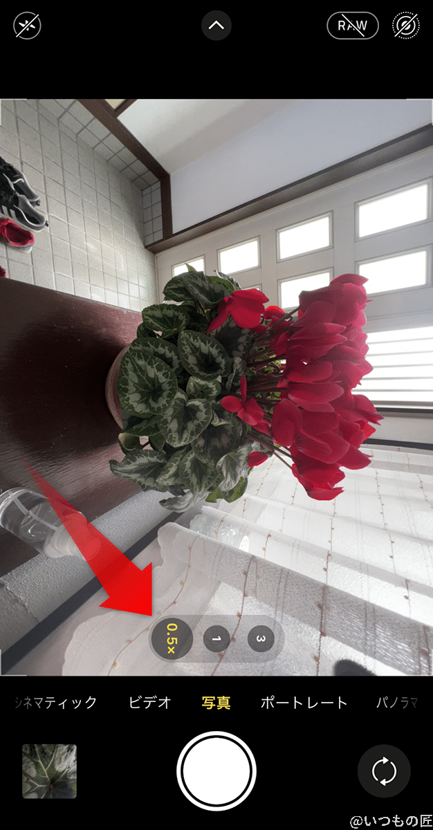 あるいは、超広角レンズ(0.5xアイコン)を選んで、接近して撮影します。