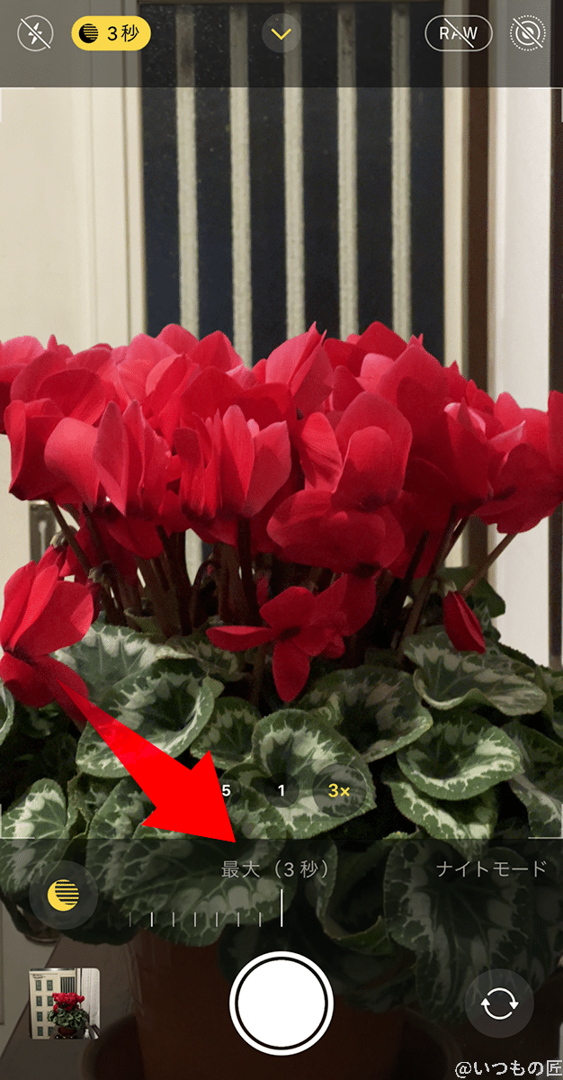 ただし、設定した最大秒数のうち、暗さによって撮影秒数が決まりますから、撮影する間はiPhone13を動かさないようにしなければなりません。
