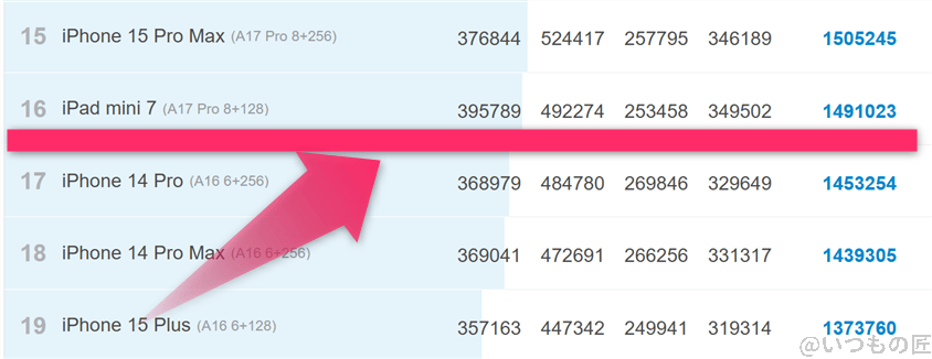 iPhone15シリーズおよびiPhone14 Proシリーズを上回りましたが、iPad mini7/iPhone15 Proシリーズは下回る順位です。